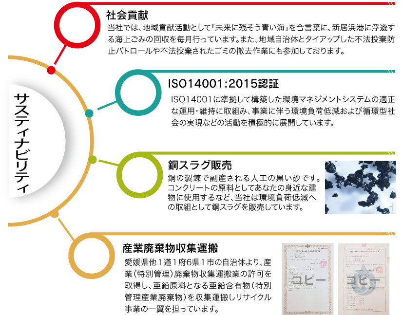 当社は、住友金属鉱山株式会社の物流会社として、港湾運送、構内物流、内航海運、陸上運送ほか幅広い分野での物流を担い、原料・製品等の安全・安定輸送に努めてまいりました。