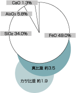 | 成 分 | 酸化鉄(FeO)、珪酸(SiO2)、酸化カルシウム(CaO)、酸化アルミニウム(AI2O3)が主な成分であり、物理的、化学的にきわめて安定しています。 水による溶出水の性状 法令で定められている方法で、溶出試験をした結果、重金属等有害物質の溶出は環境基準値をクリアしています。 粒度分布が安定して、比重は天然砂を上回り、硬い材質、高い透水性等の優れた特性を有しています。 |